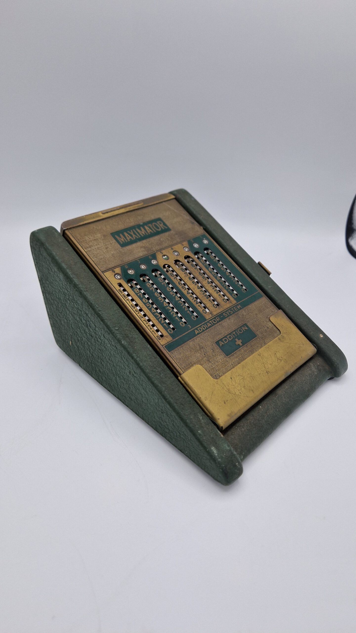 Das flache, handliche Gerät arbeitet ohne Zahnräder oder komplexes Innenleben: Im Inneren befinden sich lediglich vertikal bewegliche Streifen, jeweils einer für jede Dezimalstelle. Über schmale, auf der Vorderseite sichtbare Schlitze werden diese Streifen mit einem Griffel bewegt, sodass Additionen und Subtraktionen direkt als Klarschrift-Ergebnis in einem Anzeigefeld erscheinen. Charakteristisch ist dabei die geschwungene Führung am Ende des Schlitzes, durch die beim Überschreiten der Zehnergrenze automatisch ein Übertrag in die nächsthöhere Stelle ausgelöst wird. Gerechnet wird von rechts nach links, also beginnend mit der Einerstelle – ein Verfahren, das die Logik des Dezimalsystems auf einfache, beinahe didaktische Weise sichtbar macht. Der Griffeladdierer verbindet damit funktionale Präzision mit bemerkenswerter konstruktiver Eleganz: Als mechanisches Alltagsinstrument zeigt er, wie mit minimalen Mitteln eine zuverlässige Rechenoperation ermöglicht werden konnte. Zugleich verweist der „Maximator“ auf eine Zeit, in der Rechnen noch als händischer, nachvollziehbarer Vorgang erfahrbar war und technische Hilfsmittel vor allem durch einfache, robuste Lösungen überzeugten